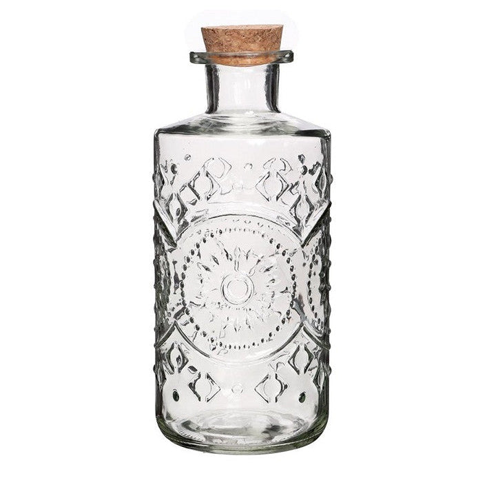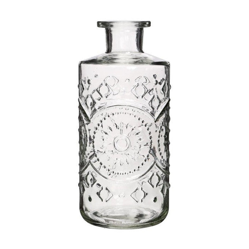 Florero de vidrio grabado con forma de botella.