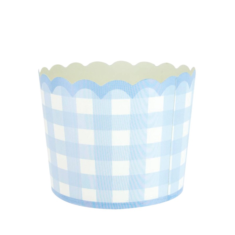 Bases de cartón con estampado vichy celeste y un elegante borde dorado festonado. Perfecto para colocar cupcakes, golosinas o palomitas.