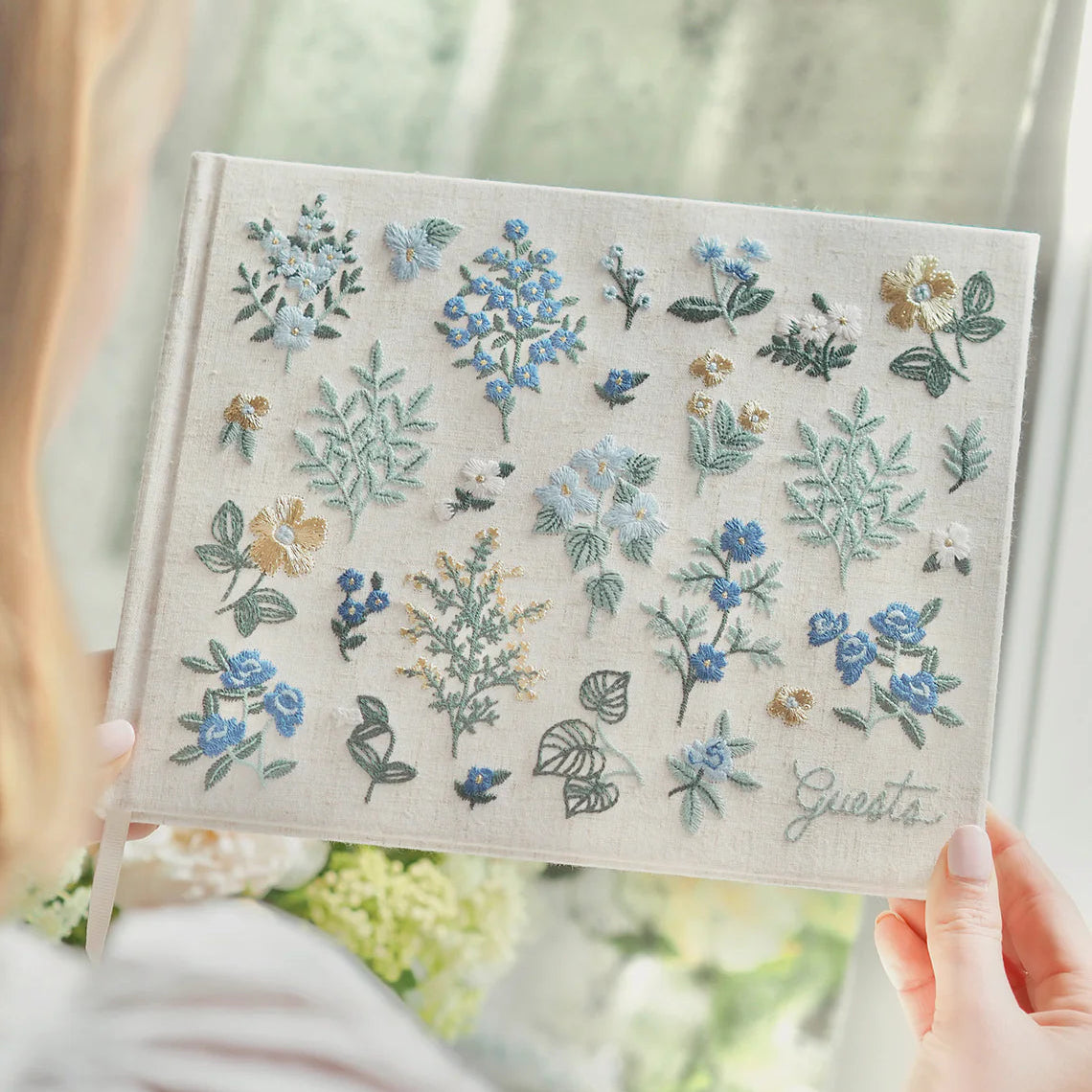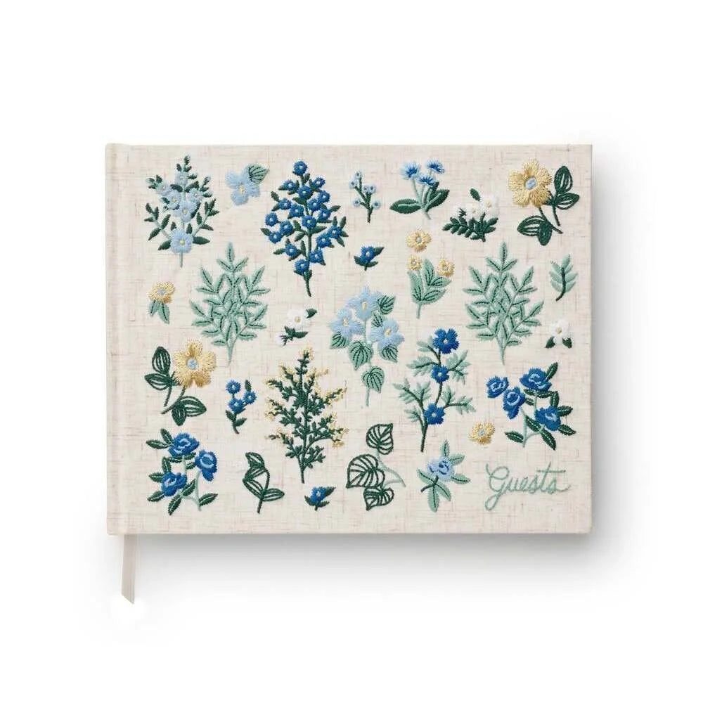 This Rifle Paper Co guest book comes in a luxurious, hardcover edition, with an embroidered fabric cover and floral motifs.