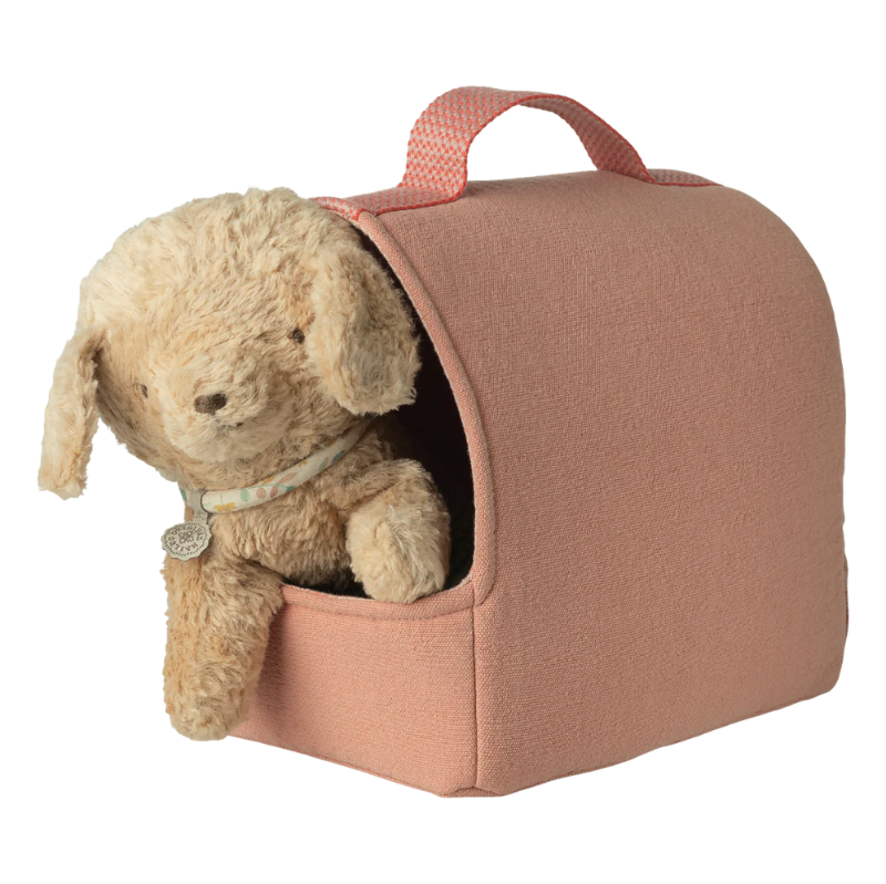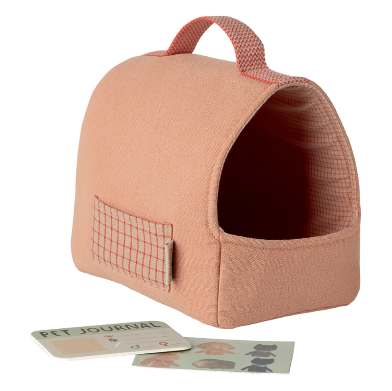Amplía la historia y la escena de juego de tu cachorrito de peluche con accesorios preciosos. Este transportín está pensado para llevar a tu amigo por todas partes con facilidad. Incluye una chapita identificativa para que puedas escribir su nombre y enganchar una foto.