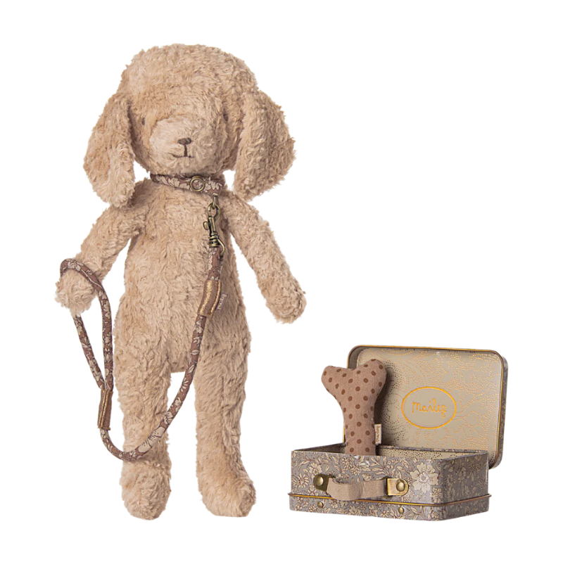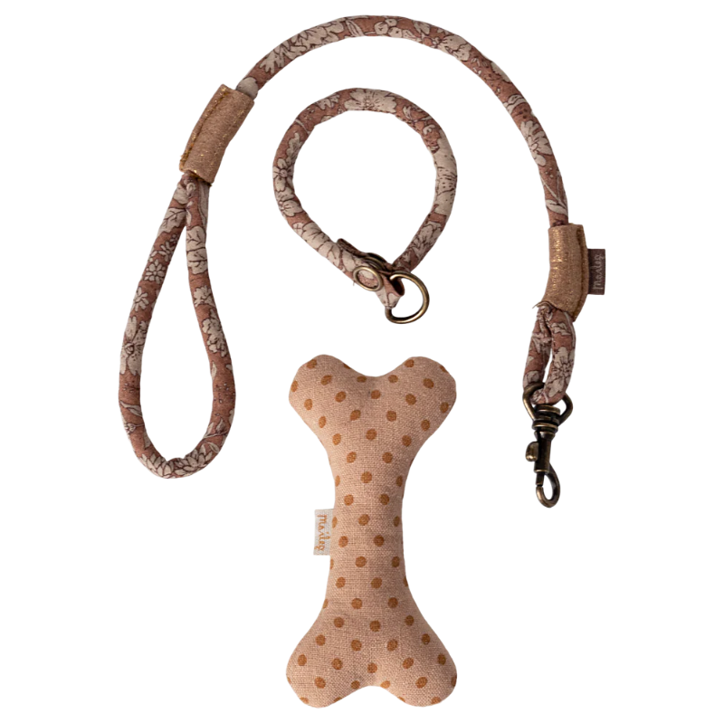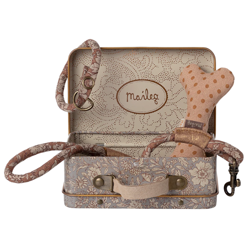 Este set es todo lo que necesitas para tu perrito peluche. El set incluye un hueso, collar y una correa; muy bien empaquetados en una maleta metálica con un bonito estampado de Maileg.