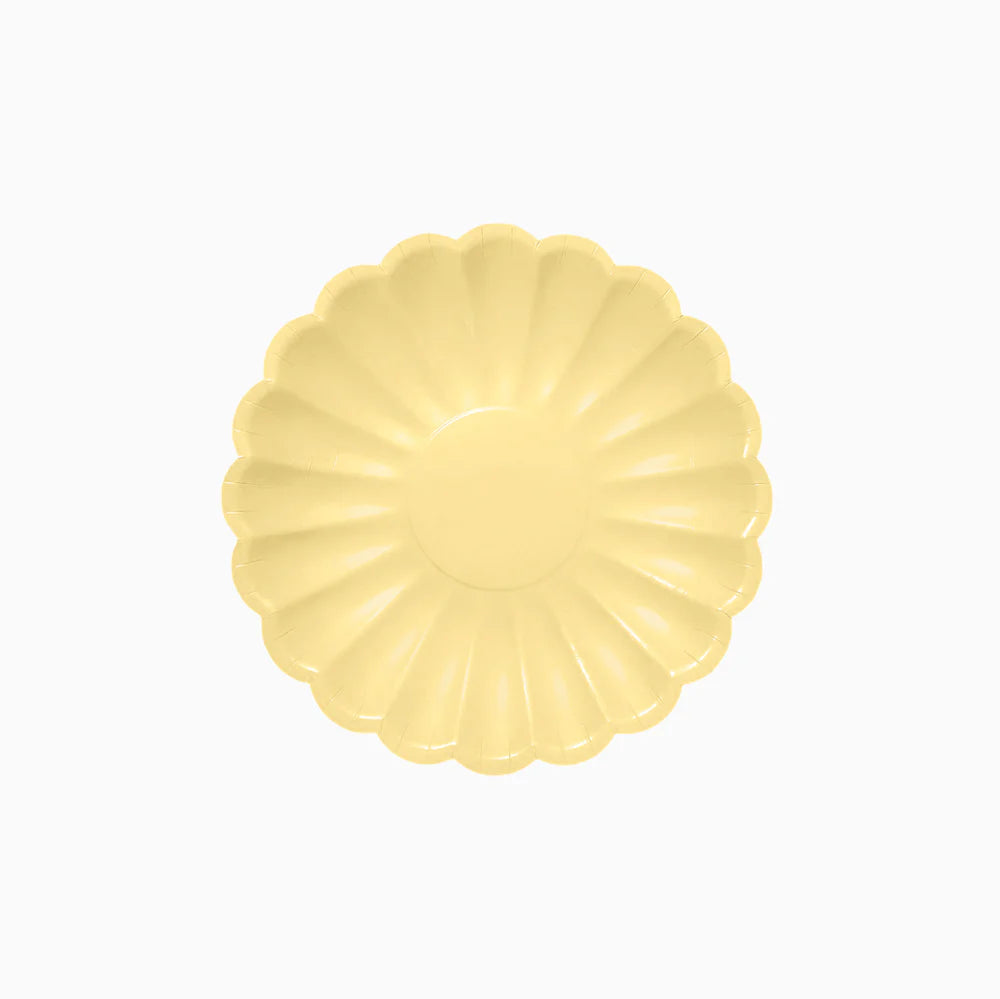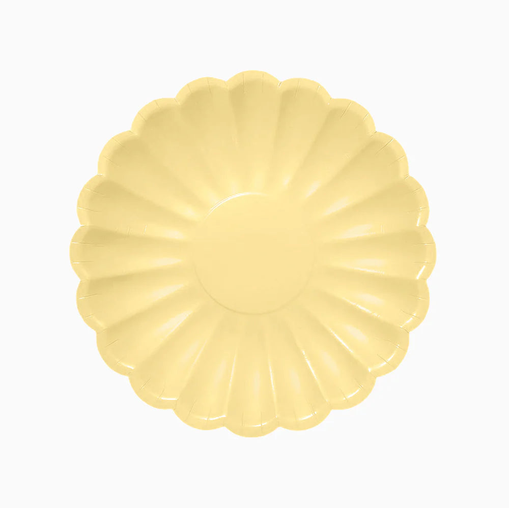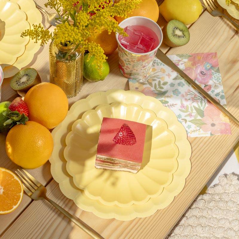 Estos platos de cartón en amarillo claro con borde festonado son un básico imprescindible en tu mesa de fiesta. Su color y forma los hace muy elegantes y fácil de combinar para cualquier temática.