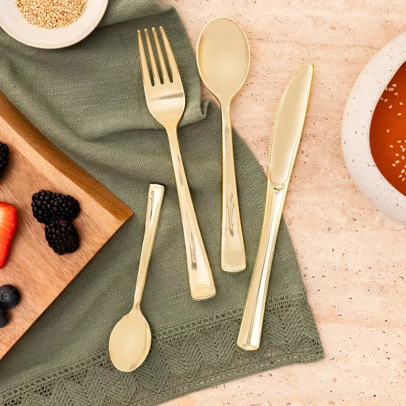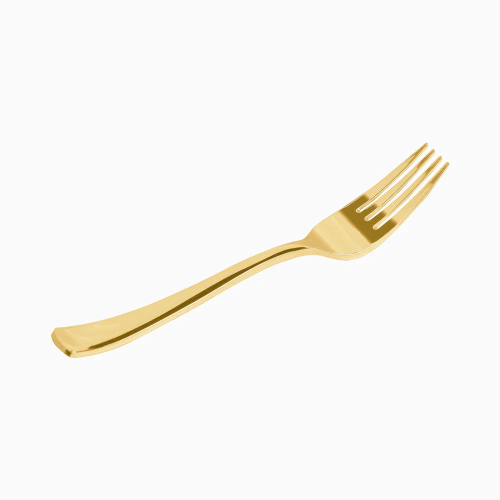 Tenedores de 18,5 cm de plástico reutilizable en color dorado. Con acabado de brillo, gracias a su mayor calidad son más rígidas, elegantes y resistentes.