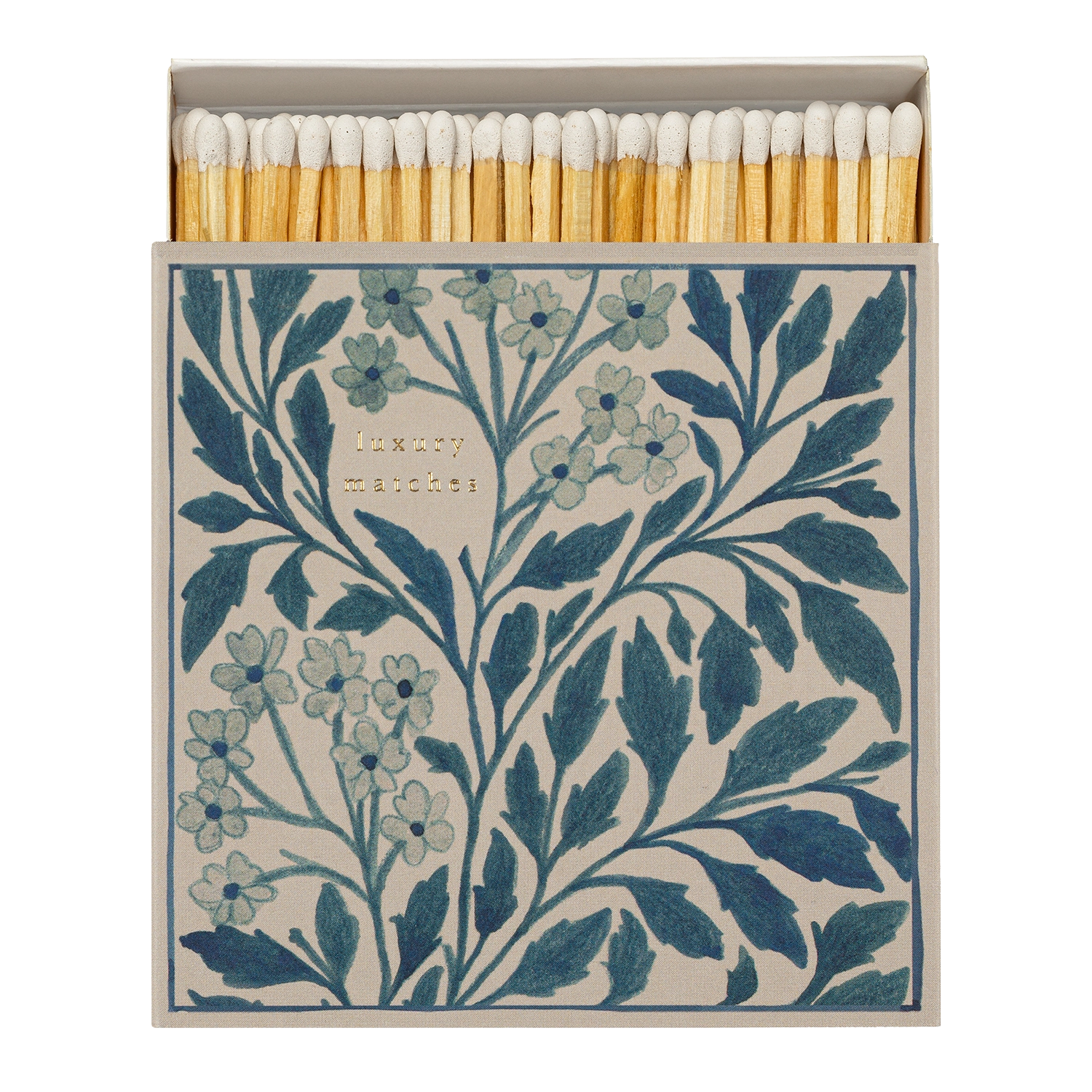 Nuestra icónica caja de cerillas cuadrada con un precioso diseño botánico azul de hojas y flores, y las palabras “Luxury Matches” en dorado.