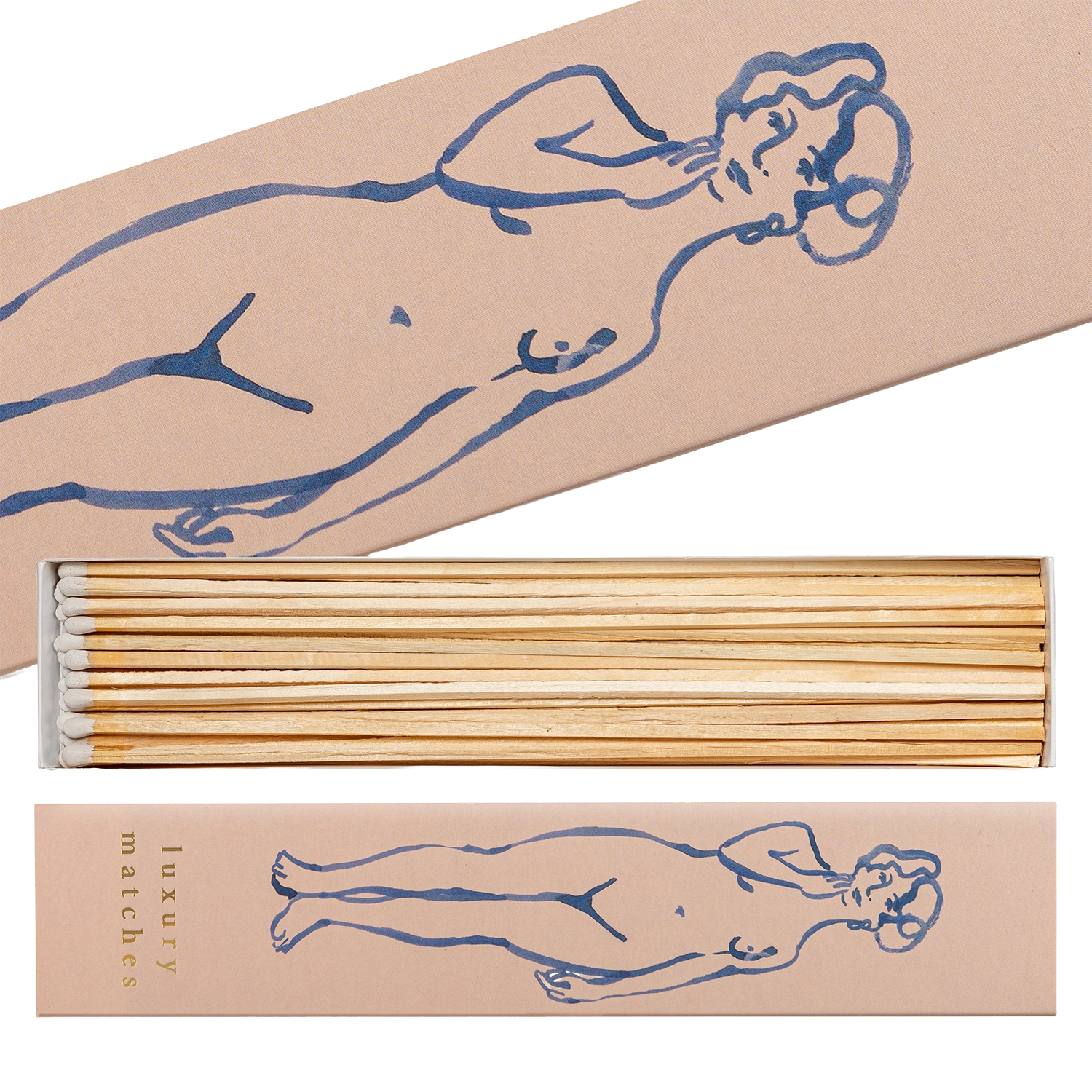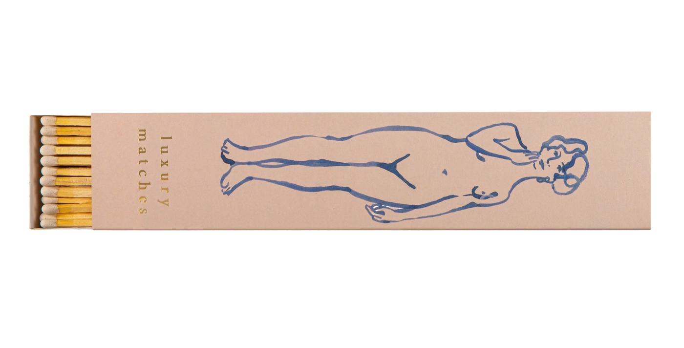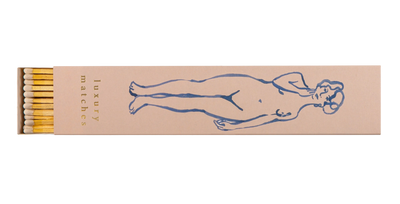Nuestra caja de cerillas larga con un dibujo lineal azul de una silueta femenina desnuda sobre un fondo rosa empolvado, y las palabras “Luxury Matches” en dorado.