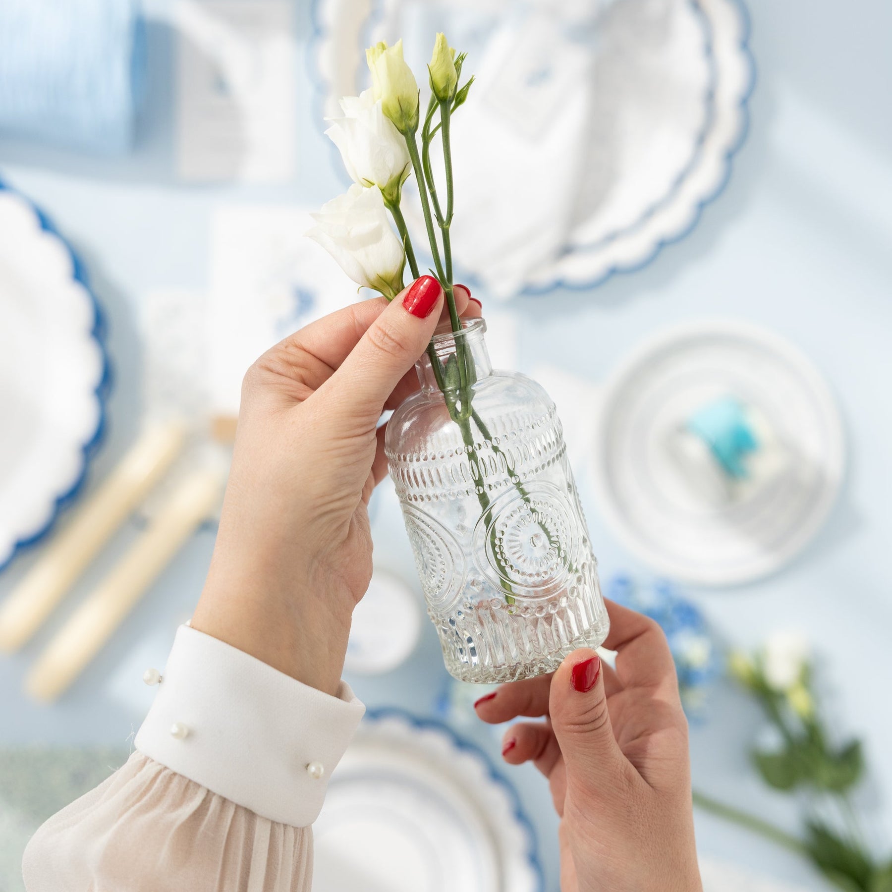 Botellita de vidrio reciclado grabada, ideales para montar un centro de mesa.