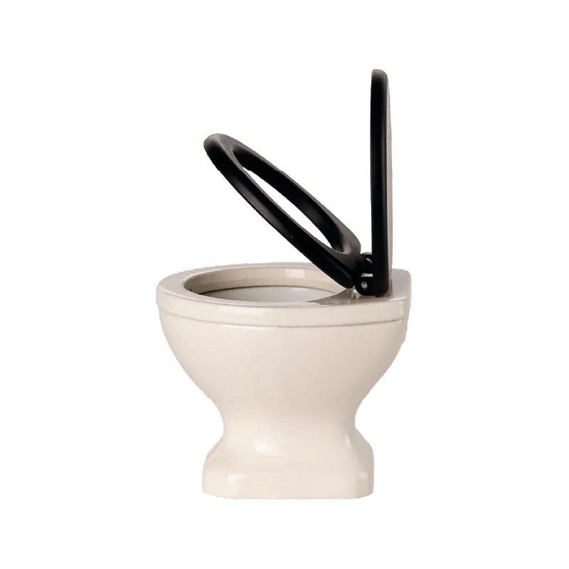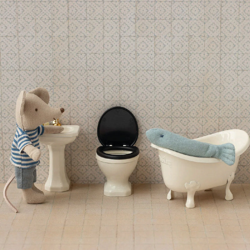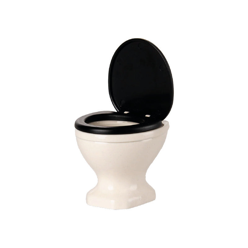 Se añade un inodoro al surtido de artículos para el baño. Está bellamente elaborado en un color blanquecino con un asiento negro. El asiento se puede abrir y cerrar. Tiene el tamaño perfecto para la familia de ratones.