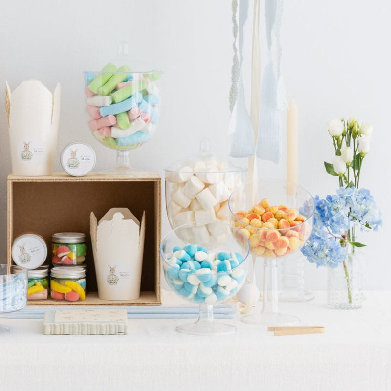 Con este kit personalizado tendrás todo lo que necesitas para montar tú misma una Candy Bar ideal para una Primera Comunión. Sólo necesitarás una mesa y te recomendamos agregar un detalle floral o uno de nuestros globos hinchados en caja Iconic disponibles con envío en toda la península.