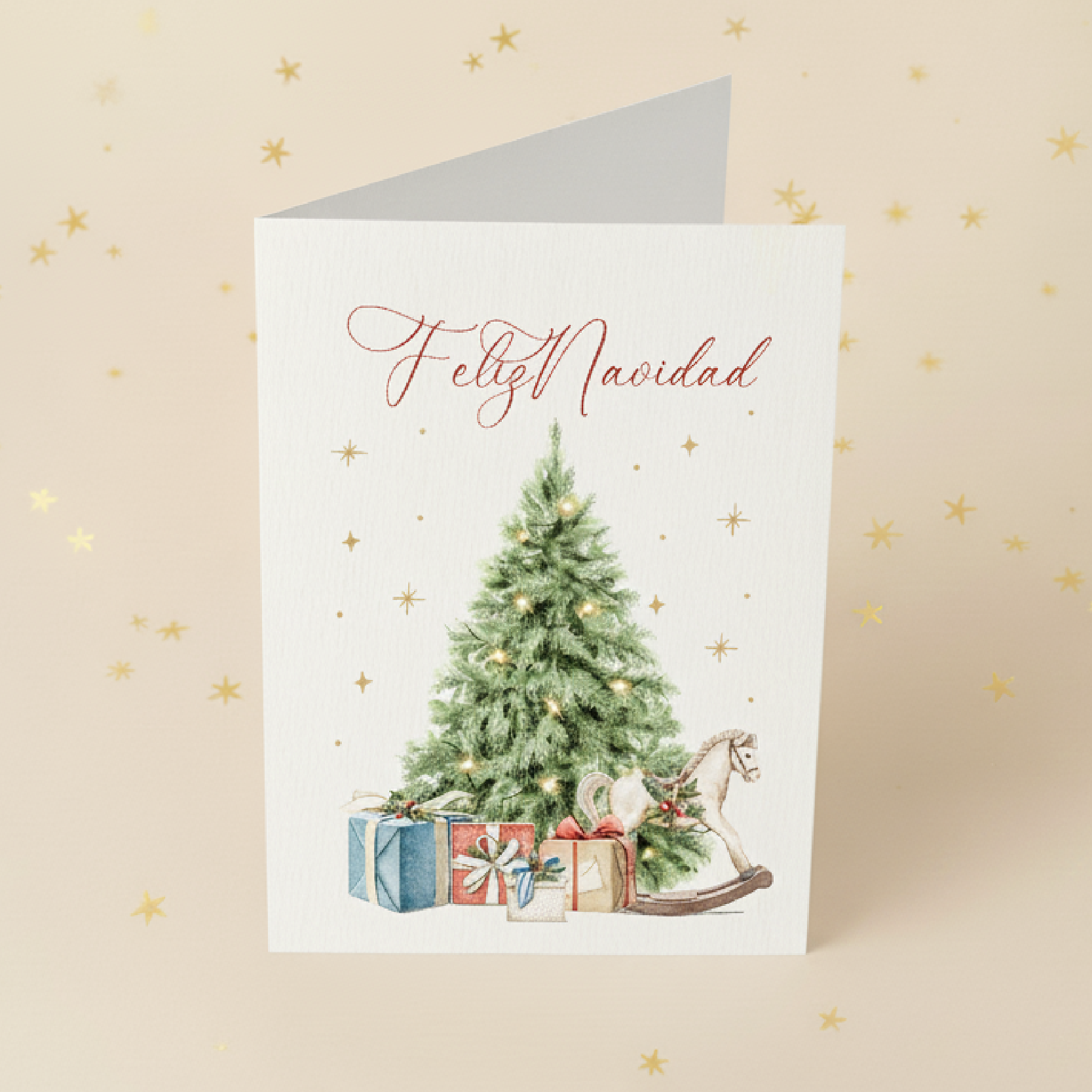 Felicita las Navidades de una forma especial con esta tarjeta con un gran árbol de Navidad decorado y con regalos. Perfecta para un bonito mensaje para atesorar y recordar.