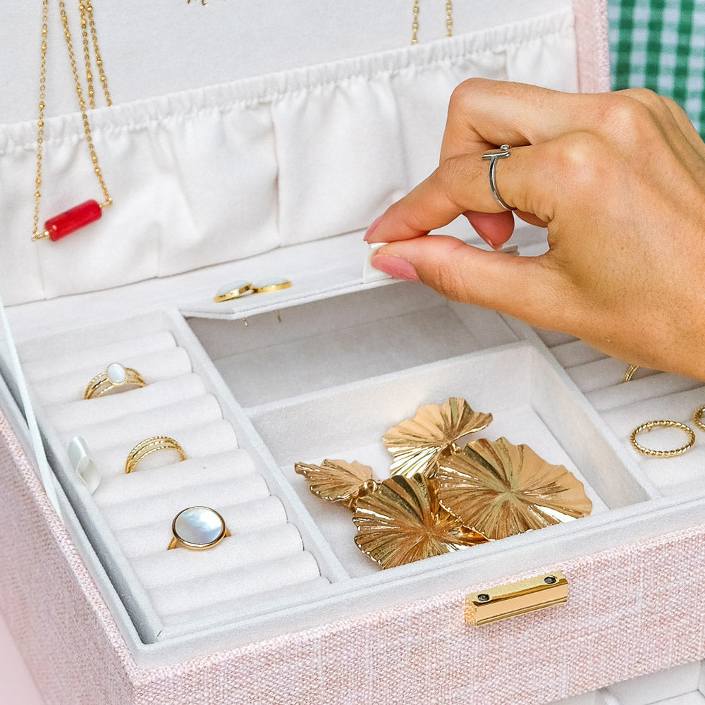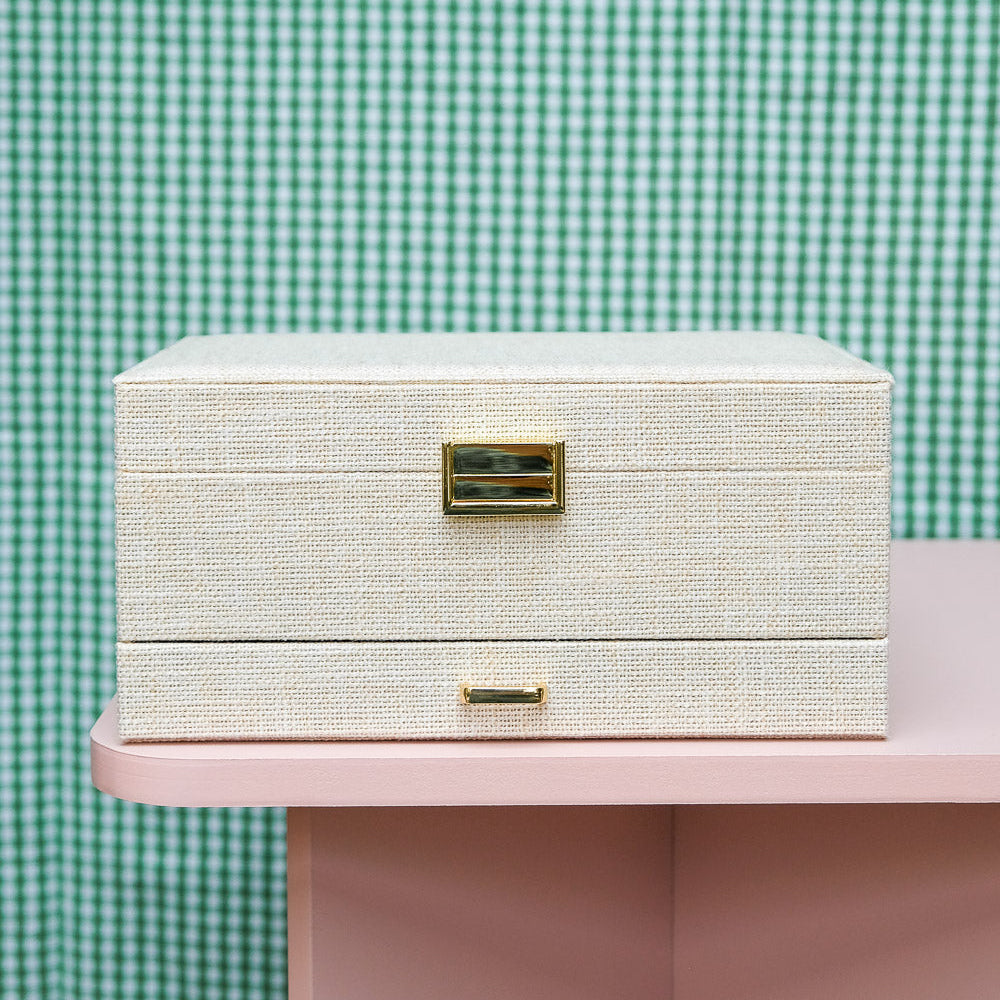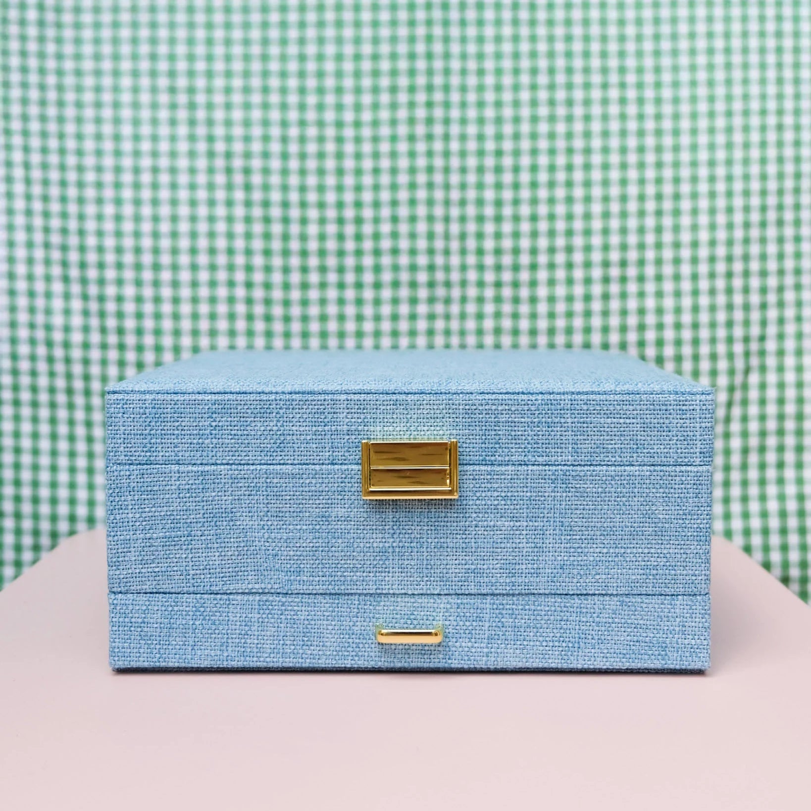 Denise es un elegante joyero rectangular de gran tamaño y calidad. Su textura efecto lino y herrajes de acero dorados lo hacen muy bonito y agradable al tacto.