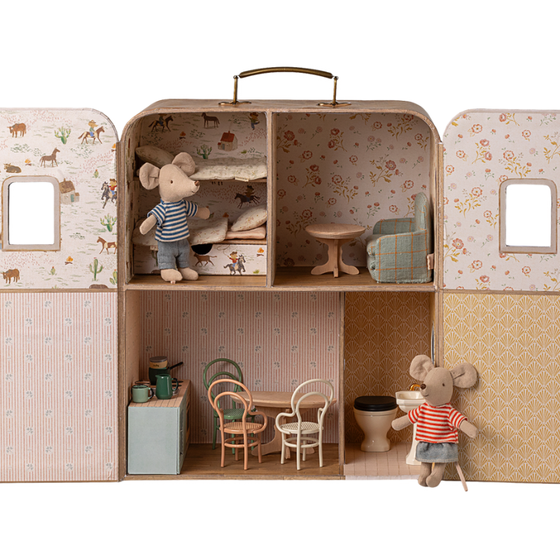 Welcome to SuitCasa, a small portable house. It's ideal for tiny mice. It includes two sets of soft bedding for your little friends, but you can buy other small furniture to decorate the house.