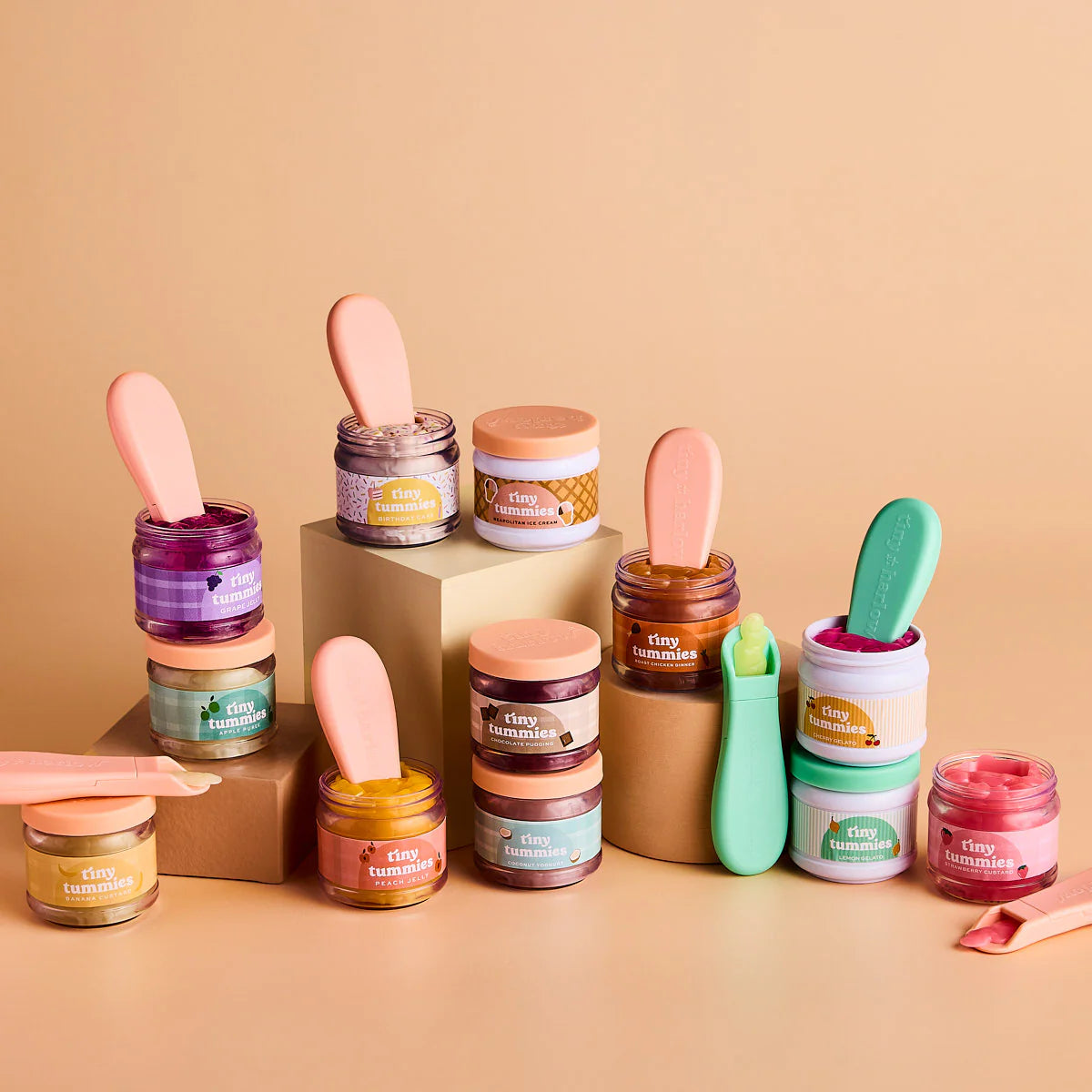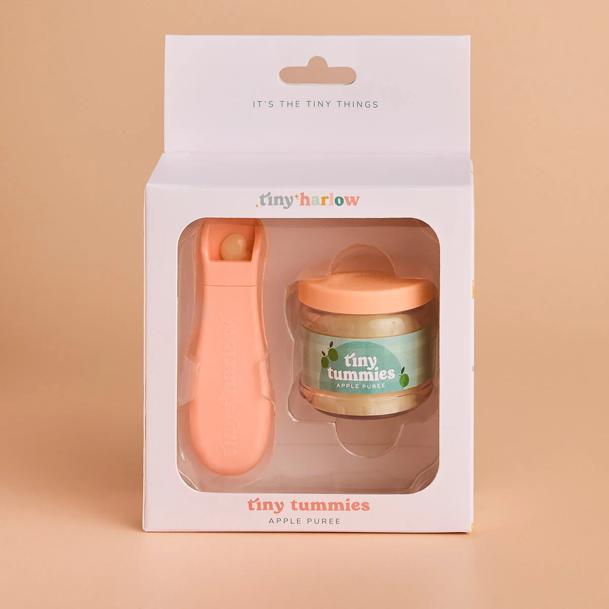 Este conjunto vem numa bonita embalagem individual e faz parte da coleção Tiny Tummies , disponível em diferentes sabores: Iogurte de coco, geleia de uva, jantar de frango assado, puré de maçã, creme de banana, creme de chocolate, creme de morango e geleia de pêssego .