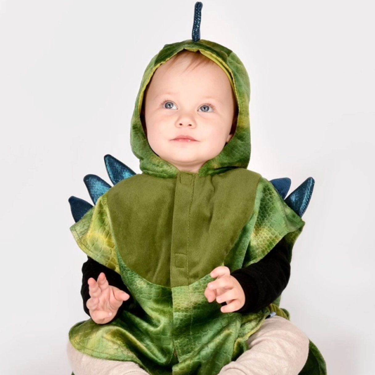 Este disfraz de dinosaurio verde no puede ser más ideal. Se cierra con velcro por la parte delantera, incluye capucha cosida y cuernos acolchados en color azul metalizado en la parte superior de la capucha. Tiene una larga cola con púas acolchadas a juego que llega hasta el suelo. En ambos laterales tiene una banda elástica.