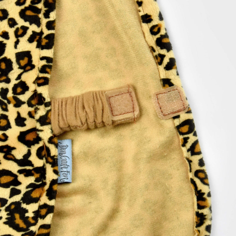 Este disfraz de leopardo no puede ser más ideal. Se cierra con velcro por la parte delantera, incluye capucha cosida con orejas incluidas y cola al final del disfraz. En ambos laterales tiene una banda elástica.