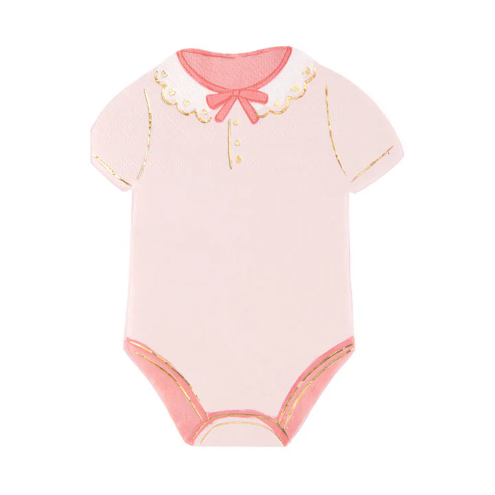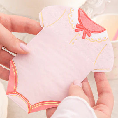 Preciosas servilletas de papel en forma de body de bebé con detalles en color rosa.