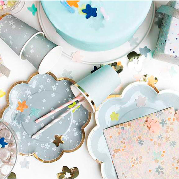 Copos de cartão cinzento com detalhes subtis de flores brancas. Têm uma bela borda dourada brilhante no fundo do vidro, o que o torna muito especial. É perfeito para uma celebração em tons neutros, para um baptismo ou Comunhão. É uma base fácil de combinar com qualquer cor.