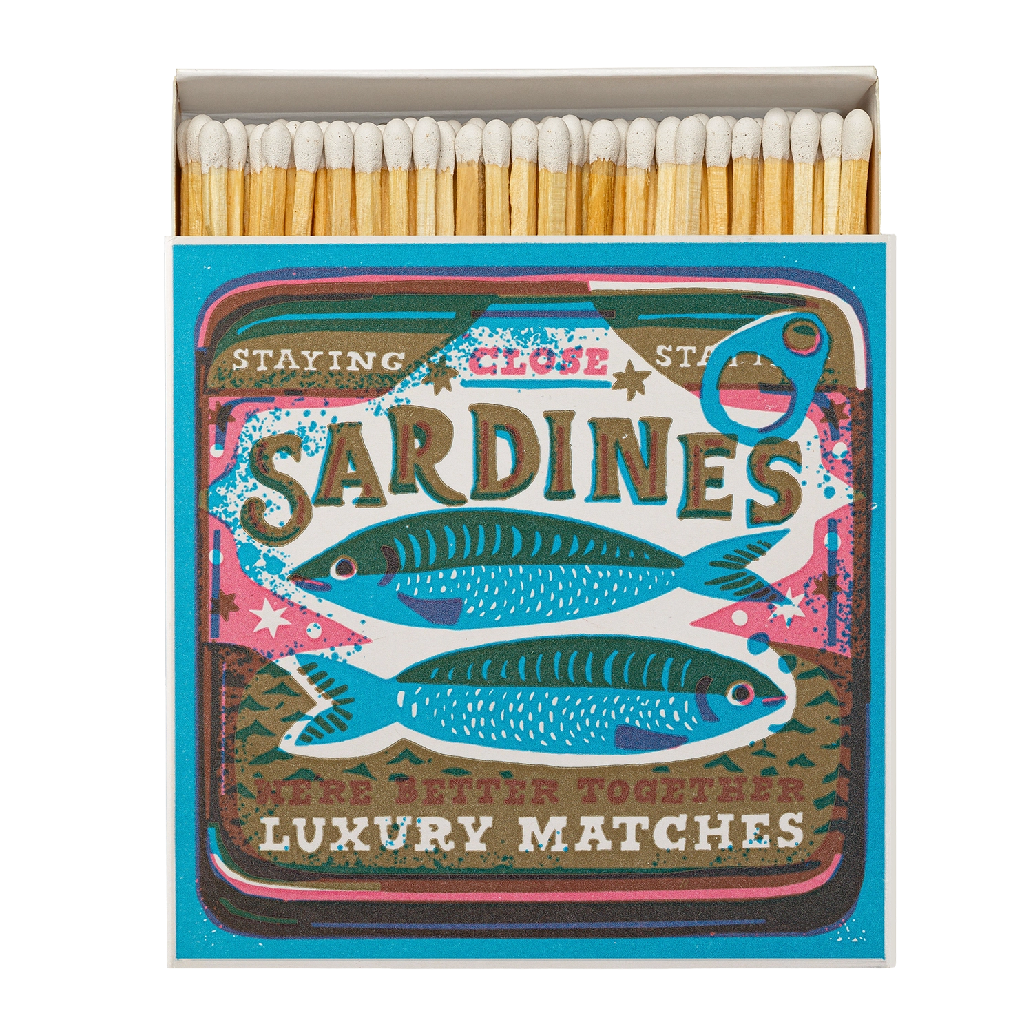 A nossa icónica caixa de fósforos quadrada com um desenho de lata mostrando duas sardinhas em tons de rosa e azul, acompanhadas das palavras “Sardinhas, somos melhores juntos, fósforos de luxo” .