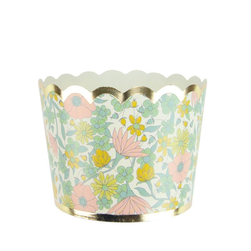 Bases em cartão com estampado Liberty rosa e uma elegante borda dourada ondulada. Perfeitas para acomodar cupcakes, doces ou pipocas.
